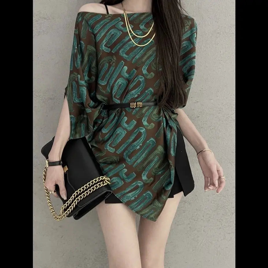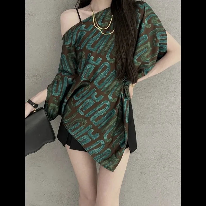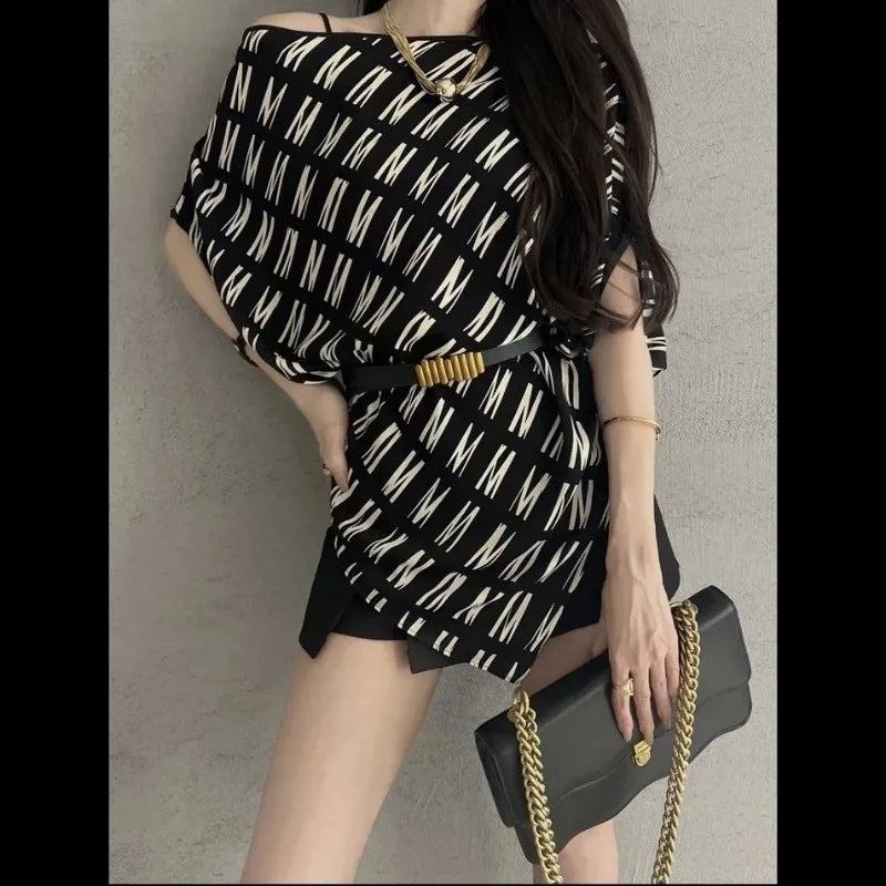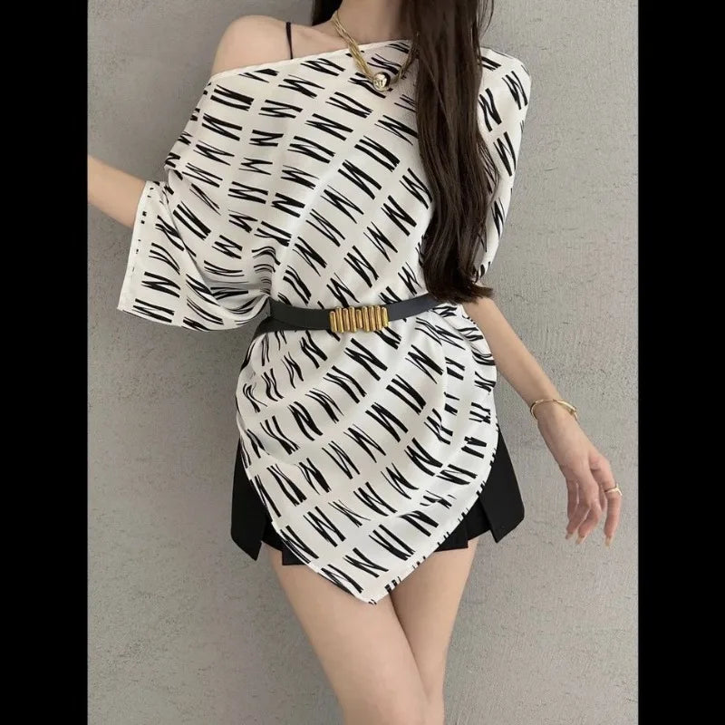 618 Fashion Elegant Trend Temperament Women's Shirt Striped Summer New Style Loose Short Sleeve Off Shoulder Irregular Tops